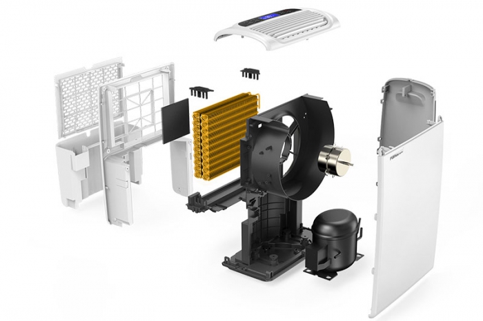 除濕器的品種許多,其間冷凍式抽濕機最為常用。濕潤的空氣經過溫度很低的蒸發器,遇冷液化成水滴,收集到水箱中或許直接經過軟管排放到室外。濕潤的空氣經干燥后還需要經過高溫的冷凝器,因此吹出來的風溫度與室溫挨近,不能起到下降室內溫度的作用。